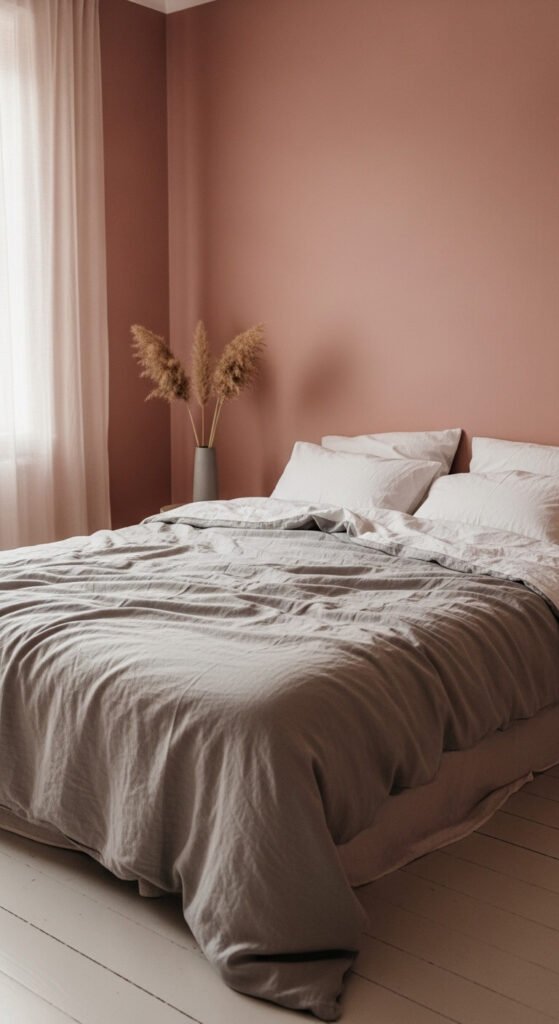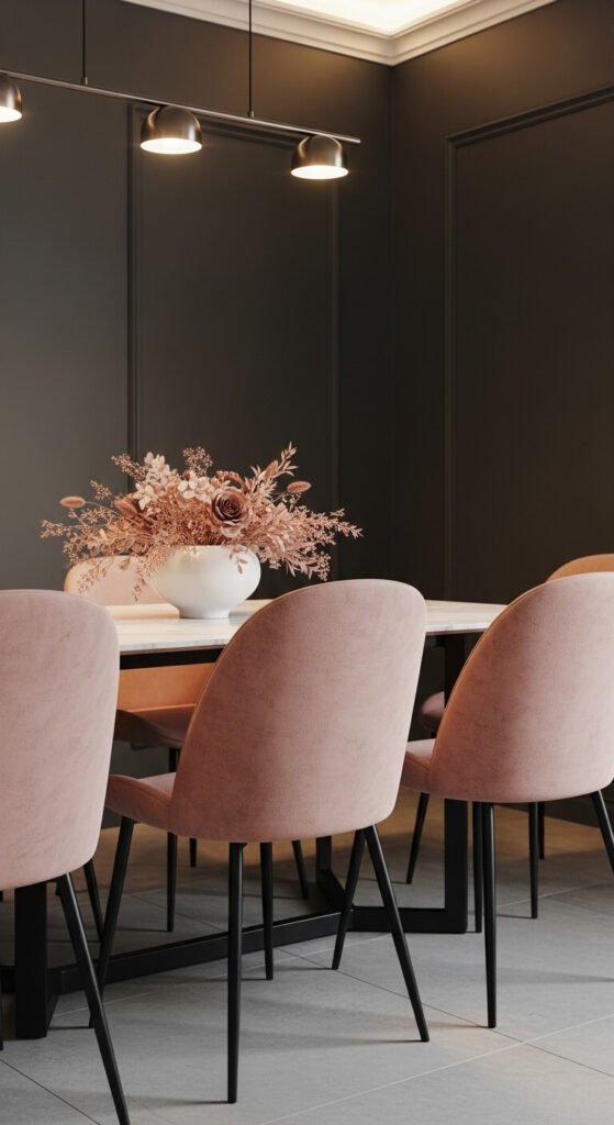 Dusty rose and warm gray is soft without being too sweet. It’s a mature take on pink that works in bedrooms, lounges, and even home offices. The gray keeps the rose grounded. The rose keeps the gray from feeling cold. To try it affordably, use warm gray walls and add dusty rose through cushions, a throw, or even a simple vase. Dried florals in rose tones are budget-friendly and long-lasting.