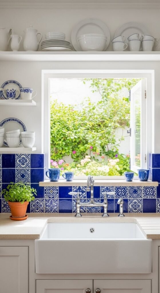 Cobalt blue and white is bold and cheerful. It draws from coastal and Mediterranean design traditions where this combination has been used for centuries. It works particularly well in kitchens and bathrooms. You can bring it in cheaply through cobalt blue dishware or a single printed tile trivet. Even cobalt blue glass bottles styled on a white windowsill creates the mood. This palette needs very little to feel complete and convincing.