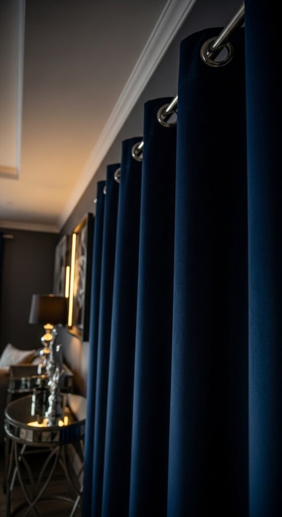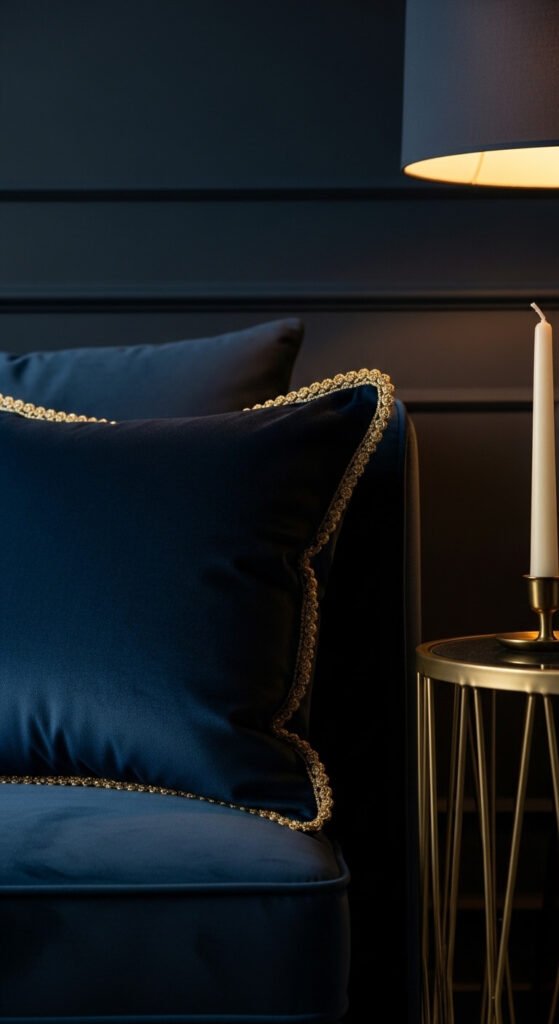 Midnight blue and silver is dramatic and cool. It suits bedrooms, home bars, and sophisticated entertaining spaces. Silver accessories — mirror frames, candle holders, or decorative trays — are easy to find secondhand. Pair them against a midnight blue backdrop and the effect feels expensive immediately. Even painting an old picture frame silver and hanging it on a navy wall creates the whole palette cheaply. This scheme photographs especially well in low evening light.