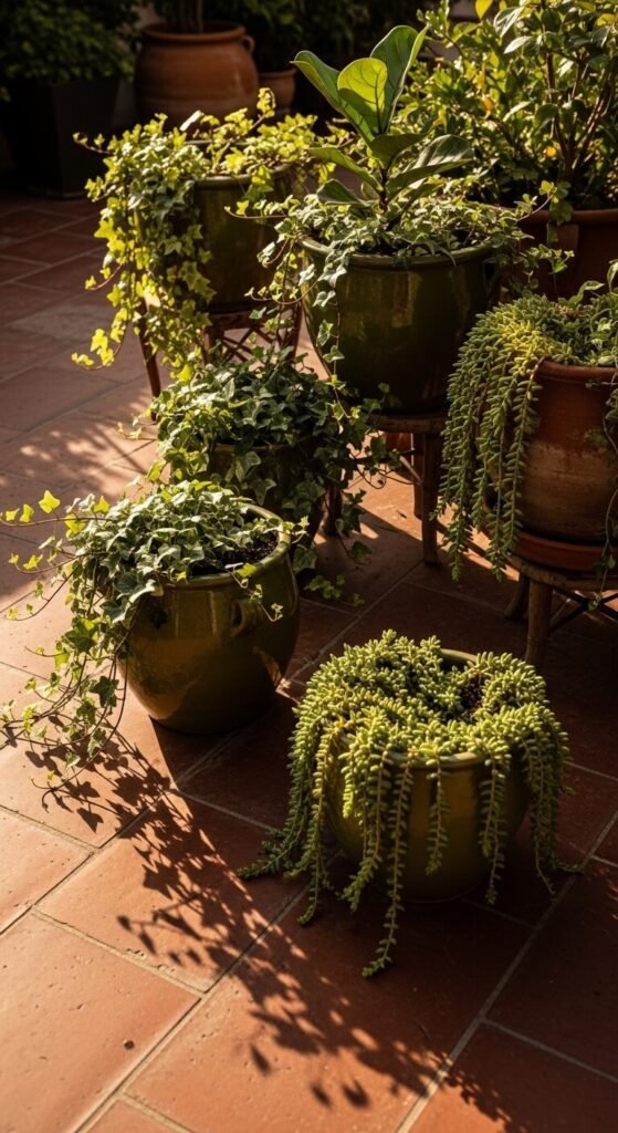 Olive green and terracotta is an earthy, sun-drenched combination. It feels organic and grounded. You see it in Mediterranean gardens and bohemian interiors alike. It’s also one of the easiest palettes to pull off cheaply. Terracotta planters cost almost nothing. Olive green is a common color for discount throws and pillow covers. Plant a few succulents or herbs in terracotta pots and set them against an olive-painted wall for the full effect.