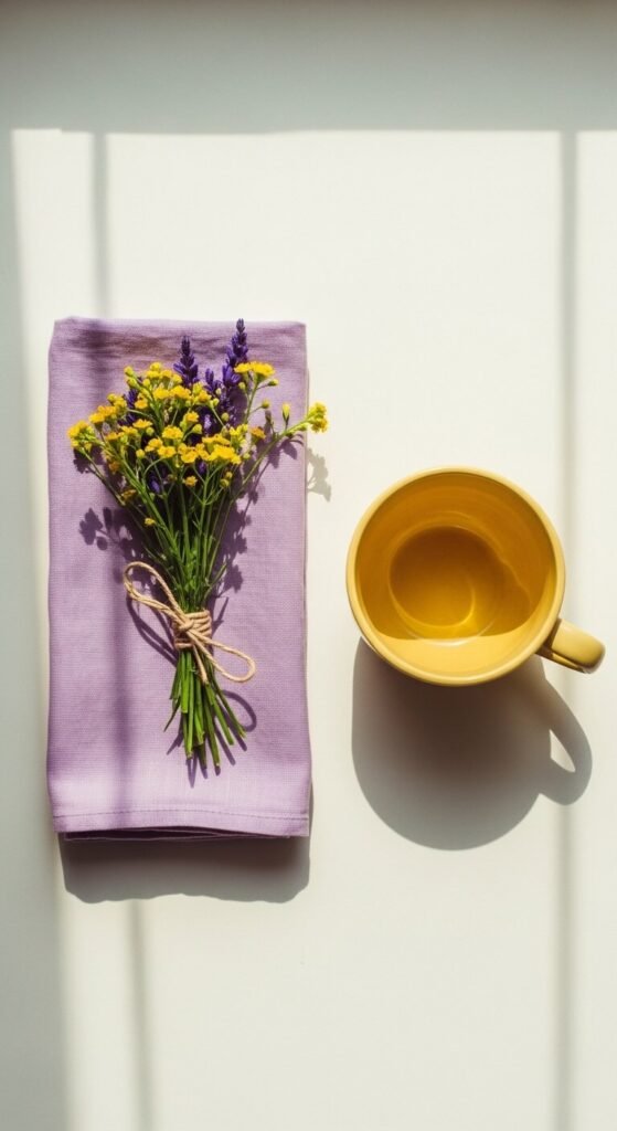 Lilac and butter yellow is joyful and unexpected. It has the energy of a wildflower field. This pairing works in children’s rooms, sunrooms, and creative studios. The key is keeping both tones soft and slightly muted — bright purple and sharp yellow would clash. Look for pale yellow curtains or bedding paired with lilac cushions or wall color. Even a butter yellow throw on a lilac chair creates an instant smile. A cheerful palette that costs very little to try.