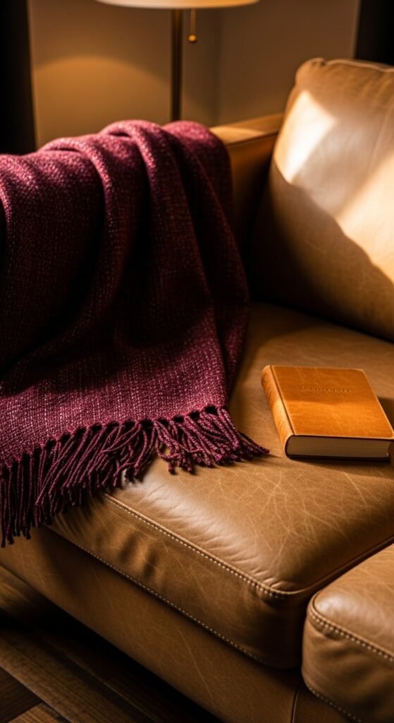 Burgundy and camel feels warm, rich, and grounded. It’s an autumnal palette that works year-round in living rooms and bedrooms. Camel tones — think tan leather, light brown linen — stop burgundy from feeling too heavy or dark. Thrift stores are full of camel-colored items. A burgundy pillow or blanket paired with a camel or tan leather item you already own is all you need. This palette looks far more expensive than it typically costs.
