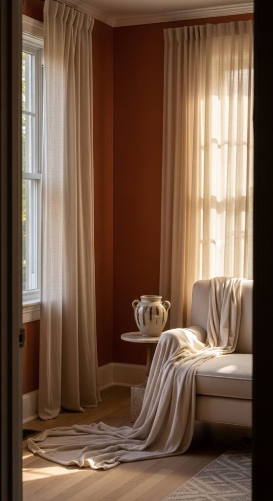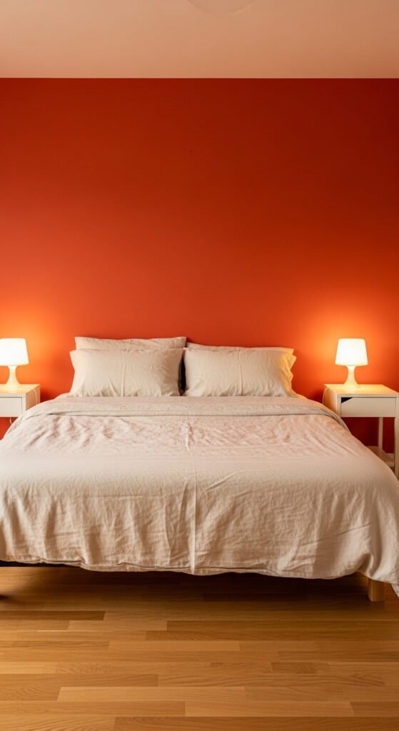 Burnt orange and cream is warm, bold, and easier to live with than you might expect. The cream balances the intensity of the orange and stops it from feeling too loud. This combination works especially well in bedrooms and living rooms. Try just one burnt orange wall behind your bed or sofa. Keep everything else cream or neutral. Add small burnt orange accents — a candle, a ceramic bowl, a single throw pillow — to tie the whole room together affordably.