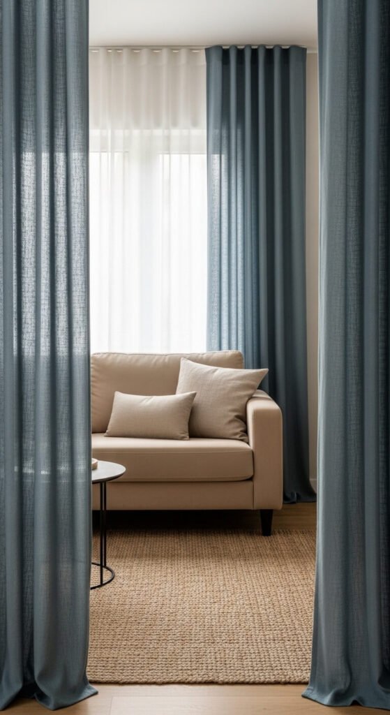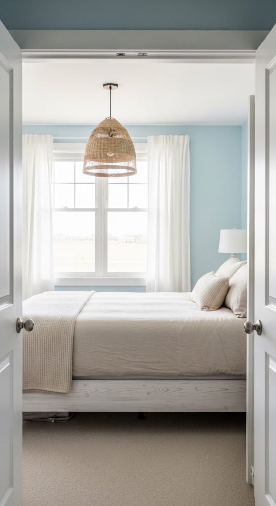 Pale blue and sandy beige captures coastal calm without resorting to clichéd anchor prints. It’s soft, light, and easy to relax in. This palette works in any room — especially bedrooms and bathrooms. Sandy beige linen is widely available and often affordable. Pale blue is a common wall paint choice sold at every hardware store. Pair them together and the result is airy, open, and genuinely relaxing. Add natural textures like rattan and jute to round it out cheaply.