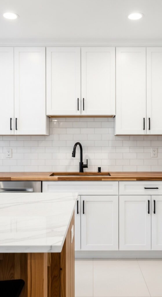 Black, white, and natural wood is the ultimate three-tone combination for modern interiors. The wood stops it from feeling too stark. The black grounds it. The white keeps it breathing. This palette works in kitchens, bathrooms, and living spaces. Swap cabinet hardware to matte black — it’s inexpensive and changes everything. Add a wood cutting board, a wooden bowl, or a small timber shelf. The palette comes together fast and holds up well over time.