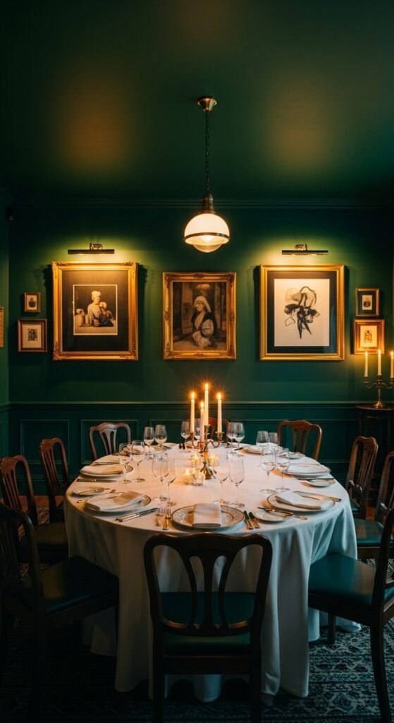 Emerald green and gold is glamorous and bold. It’s a palette that makes people stop and notice. It suits dining rooms, bathrooms with statement walls, and powder rooms where you want a strong impression. A single emerald green wall with gold-toned accessories is all you need. Hunt for gold picture frames and candleholders at thrift stores — you’ll almost always find them. Pair with white trim and the whole room comes together with just one bold wall color.