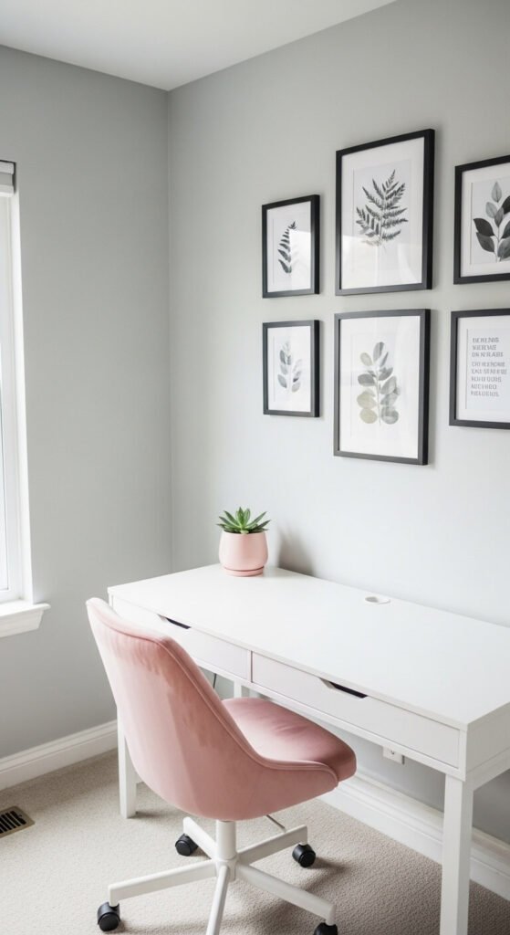 Light gray and blush is a modern and professional pairing. It works just as well in a home office as it does in a bedroom or living room. Gray provides a neutral, serious backdrop. Blush adds warmth and personality without being distracting. A blush office chair is often as affordable as a gray one. Add blush candles, a blush desk organizer, or a blush lampshade. Small, cheap additions are all that’s needed to bring this palette to life.