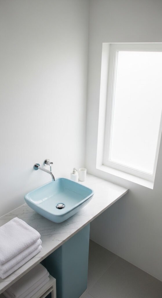Ice blue and pure white is crisp and clean. It has the feeling of a winter morning — sharp air, bright light. This palette works especially well in bathrooms and laundry rooms where you want a sense of purity and cleanliness. Ice blue towels, a blue glass soap dispenser, or blue-tinted glass bottles arranged on a white shelf are all you need. White paint is always the cheapest option. This palette is as low-cost as it is effective.