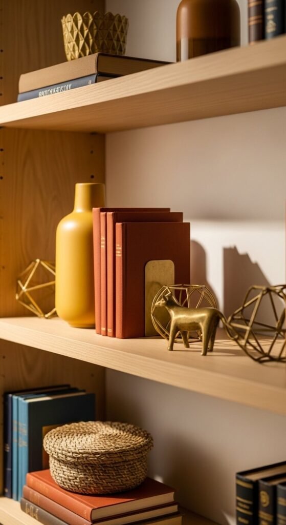 Peach and soft gold creates a glowing, warm-toned palette that’s perfect for bedrooms or lounges. It feels sun-warmed and inviting. This palette layers beautifully without needing many pieces. A peach wall with gold-framed mirrors and warm-toned lighting does most of the work. Look for gold picture frames at thrift stores — they’re almost always available cheaply. Even a peach scented candle in a gold holder adds to the palette without costing much.