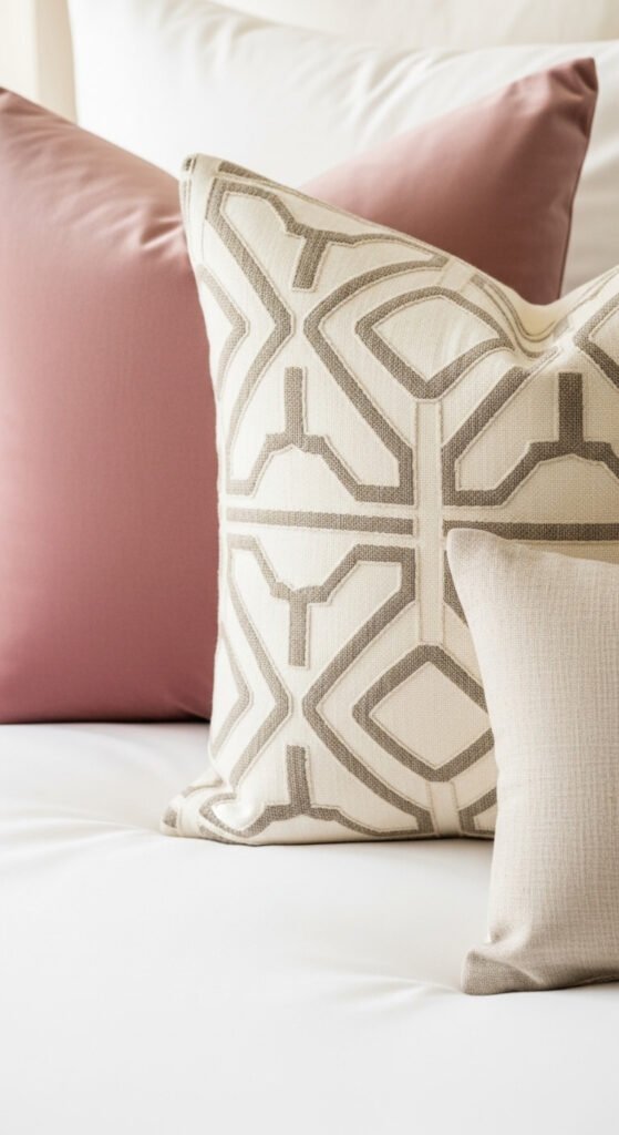 Step 3: The Front Row — Decorative Pillows This is where you add personality. Use two to three smaller decorative pillows in coordinating colors or textures. Mix a solid with a subtle pattern or a velvet with a woven fabric for that layered, curated look.