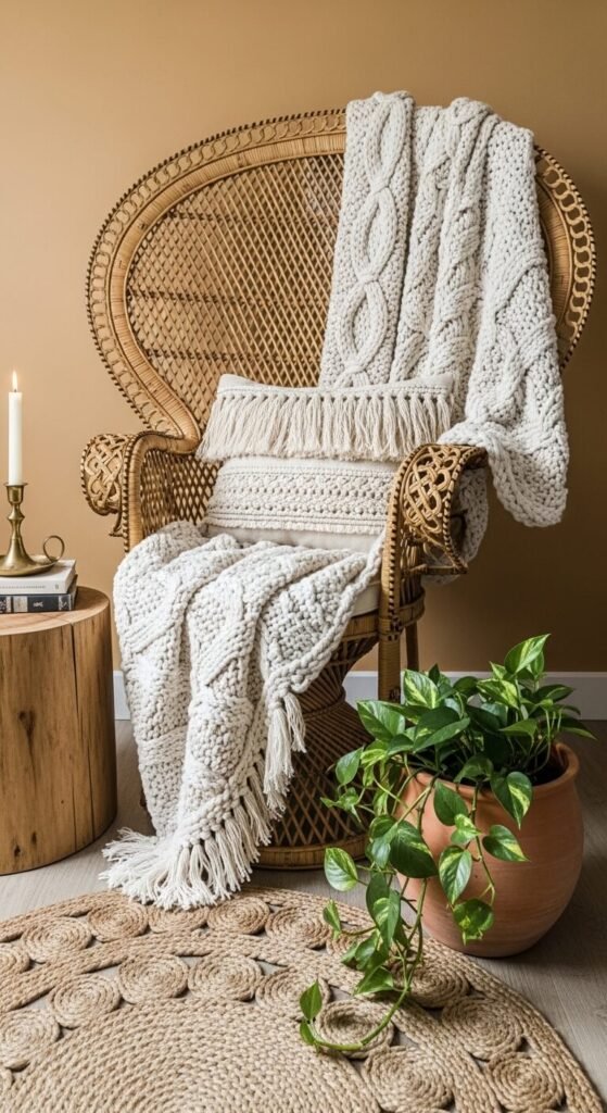 - Soft — a chunky knit throw, linen cushion, or jute rug