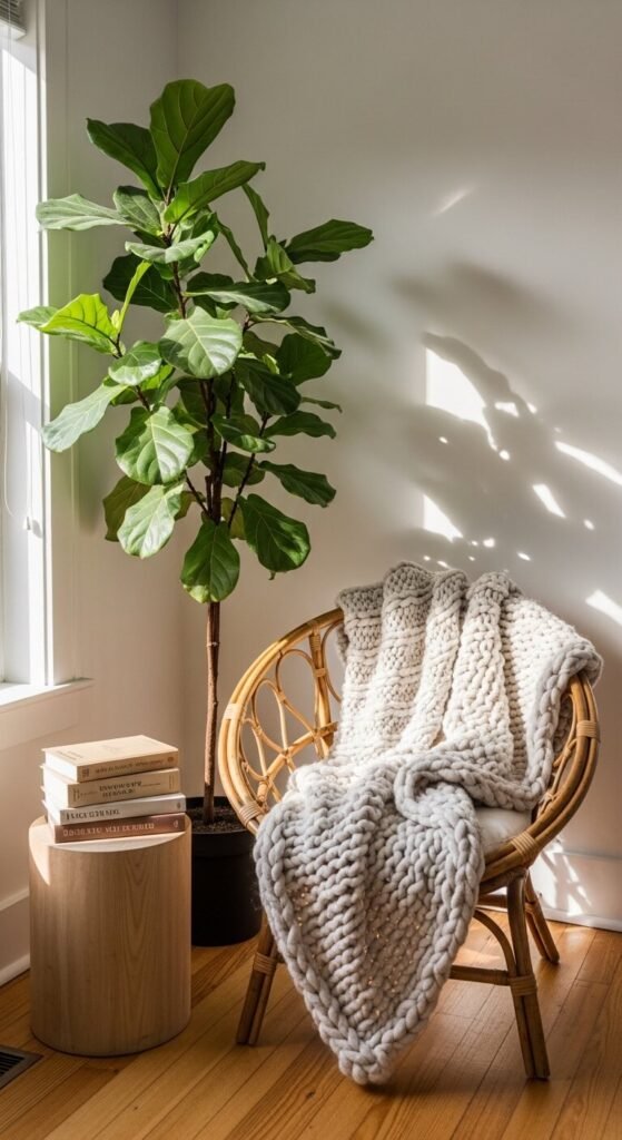 Plants change everything. A tall fiddle-leaf fig or a cluster of trailing pothos can make even the dullest corner feel alive. If your light is low, opt for snake plants or ZZ plants — they’re nearly indestructible and endlessly stylish.