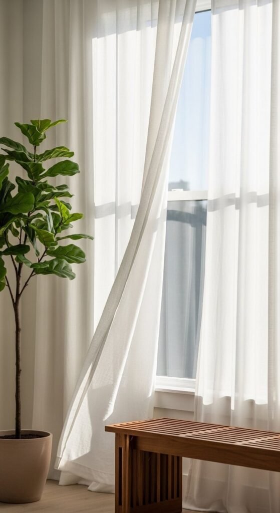 - Curtains that reach floor to ceiling — even inexpensive panels look luxurious when hung high and wide.
