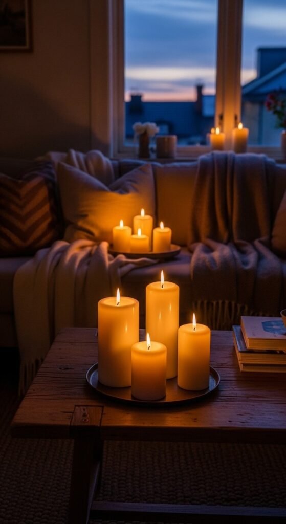 - Living room: Pillar candles, taper candles, and lanterns all work beautifully here. Warm amber or cedar scents feel welcoming for guests.