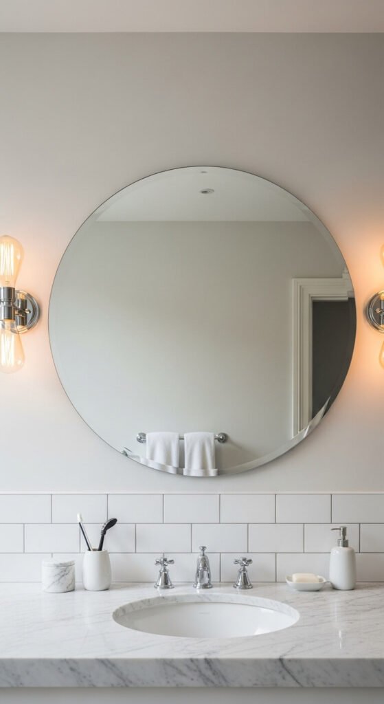 Match your mirror frame to existing hardware or furniture finishes to create a cohesive look. Or, intentionally contrast it — a rustic wood mirror in a sleek modern space creates the kind of intentional tension that looks curated, not chaotic.