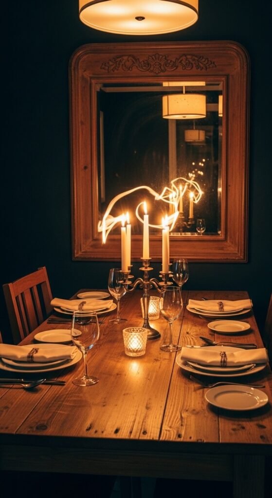 A mirror behind the dining table reflects candlelight and creates an intimate, restaurant-worthy atmosphere. This is a classic trick used in high-end interior design.