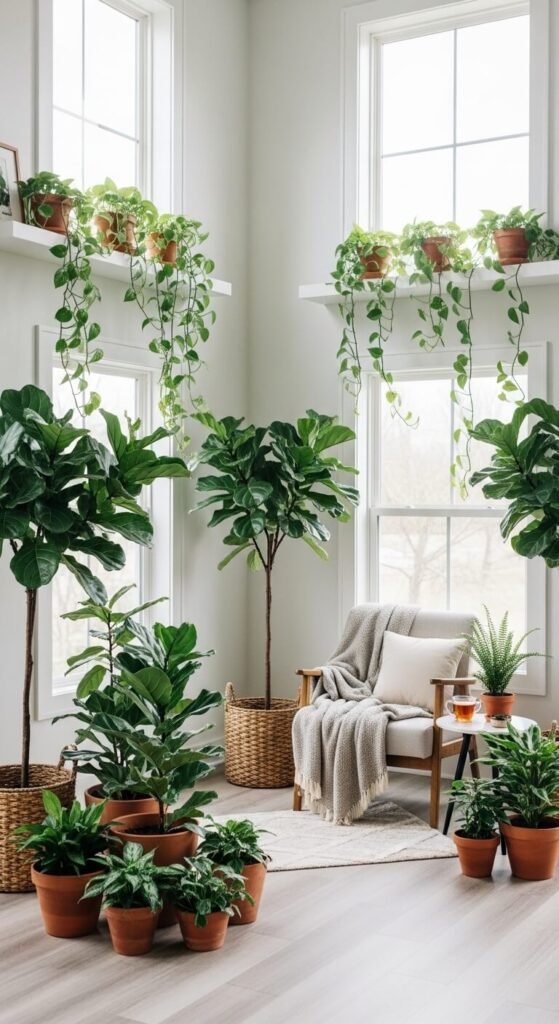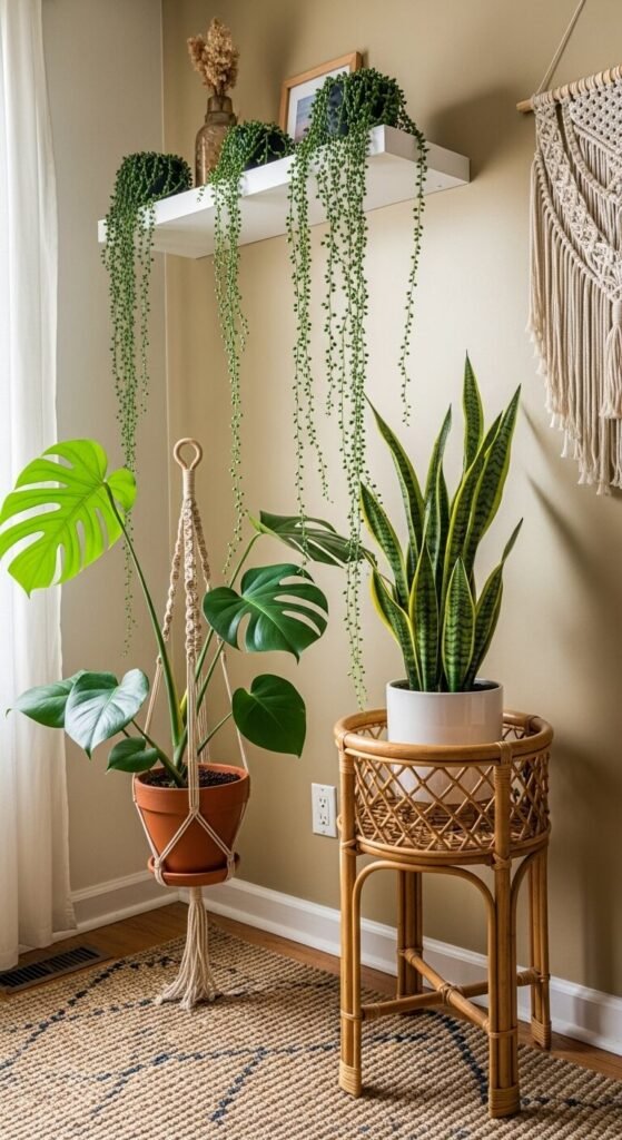 - Use medium-height plants on side tables or plant stands to fill mid-level space.