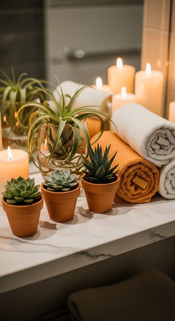 - In the bathroom — a small succulent arrangement or air plant near the sink adds spa-like serenity.