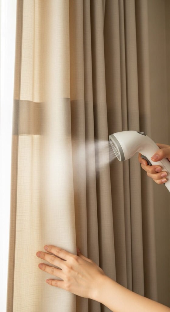 Even the most perfectly hung curtains won’t create that soaring effect if they’re wrinkled and bunched. Take time to steam your curtains after hanging, and arrange the folds evenly. This creates those crisp, elegant vertical pleats that professional designers love.