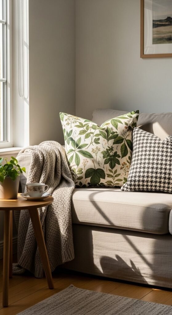 Here’s a trick the pros use constantly: texture counts as a pattern. A chunky cable-knit, a woven rattan basket, or a velvet cushion all add visual interest without technically being a “print.” This lets you layer richness without overwhelming the eye.