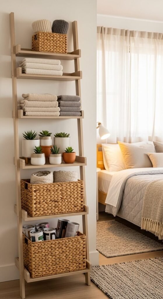 - Ladder shelves lean against walls with zero wall damage — perfect for renters