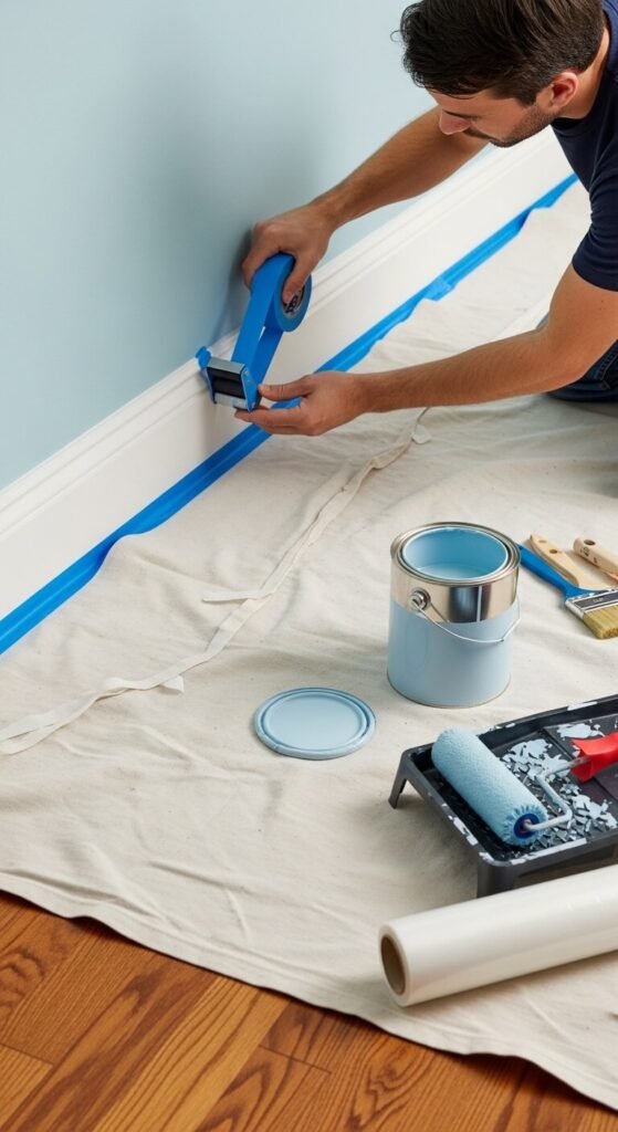 - Tape everything. Ceiling line, baseboards, adjacent walls. Take your time here — sloppy tape means sloppy lines.