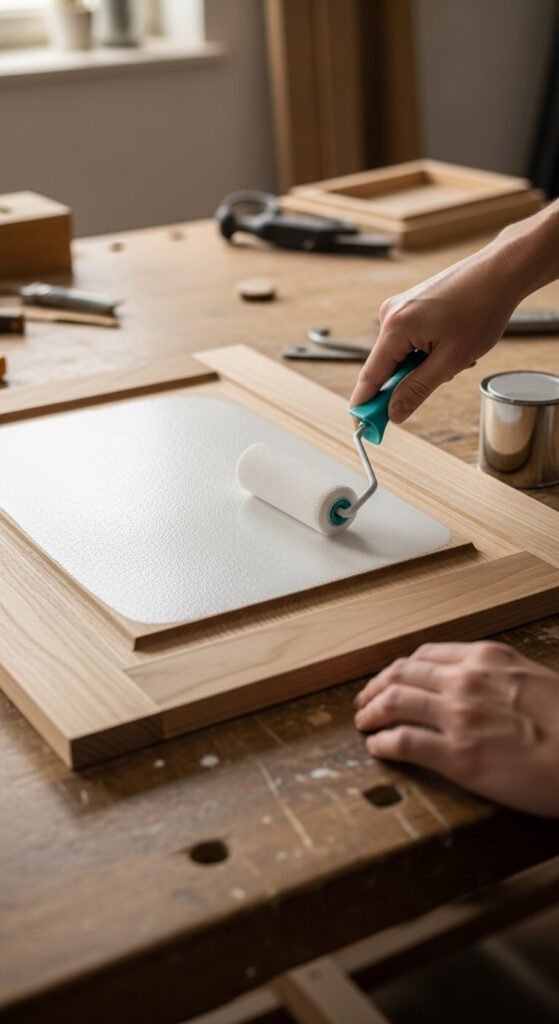 Apply your first coat of cabinet paint using a foam roller for flat panels and a brush for edges and grooves. Keep coats thin — thick paint sags and takes forever to dry.