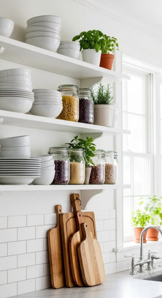 Open shelving punishes clutter in a way that closed cabinets never do. The first step isn’t decorating — it’s editing. Ask yourself: