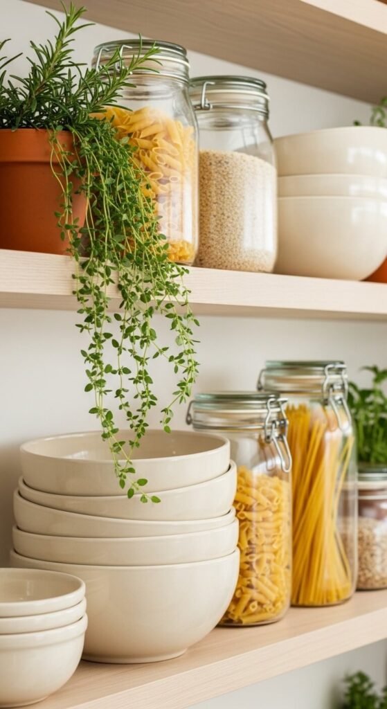 Relocate anything that doesn’t pass the test. Plastic containers, rarely-used appliances, and mismatched lids belong in a pantry or lower cabinet — not on display. Your shelves should hold only what’s both functional and beautiful.