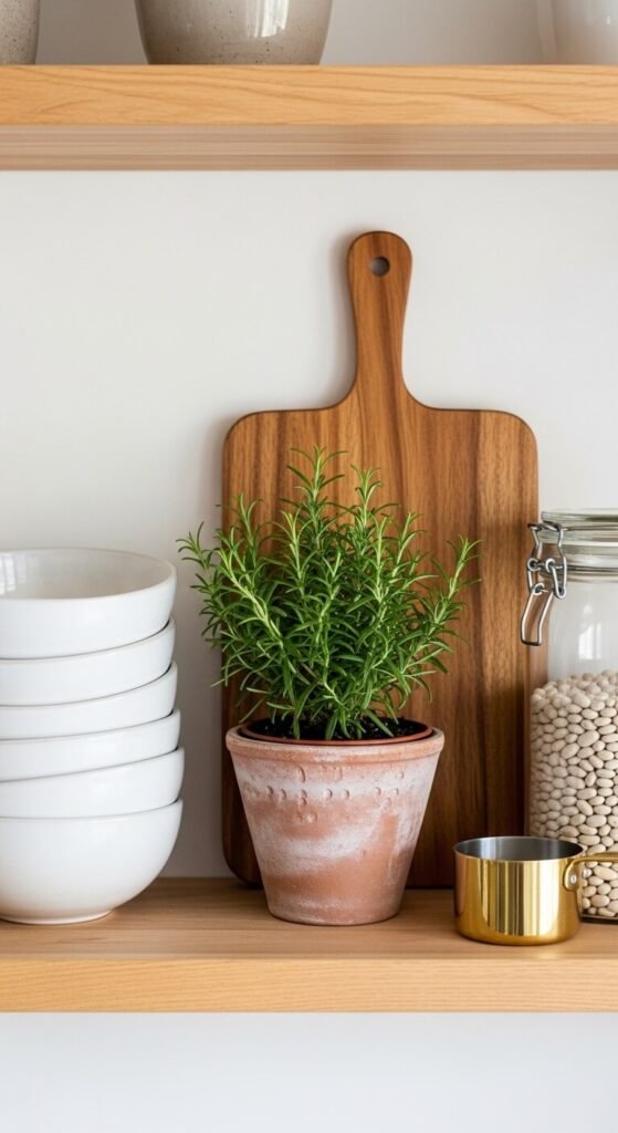 - Living elements — a small potted herb or a trailing plant adds life that no object can replicate