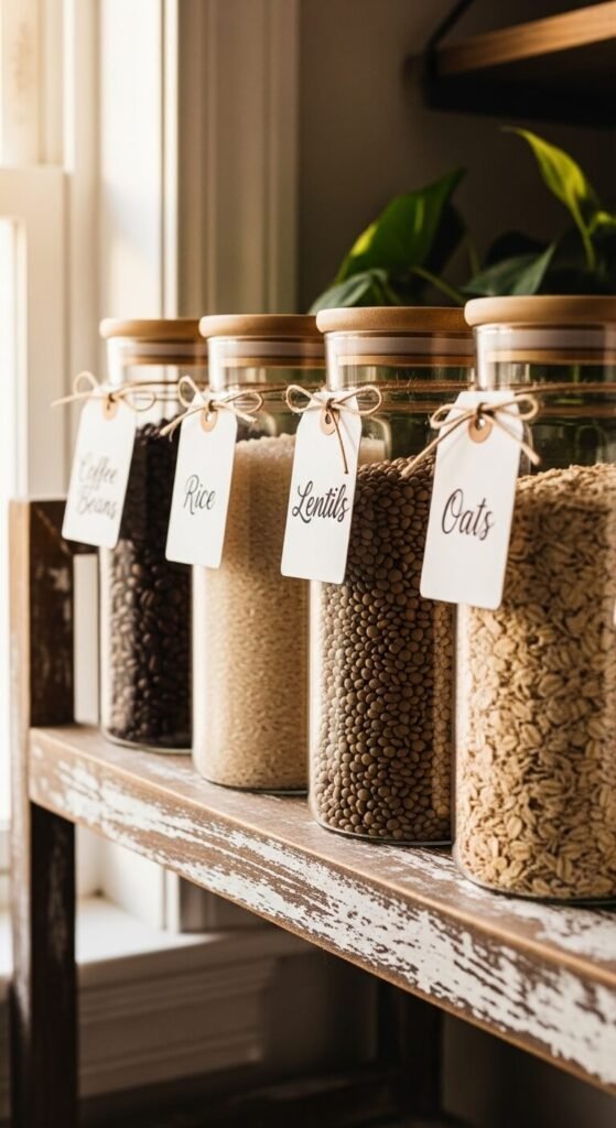 - Decant dry goods (flour, pasta, coffee) into matching glass or ceramic canisters