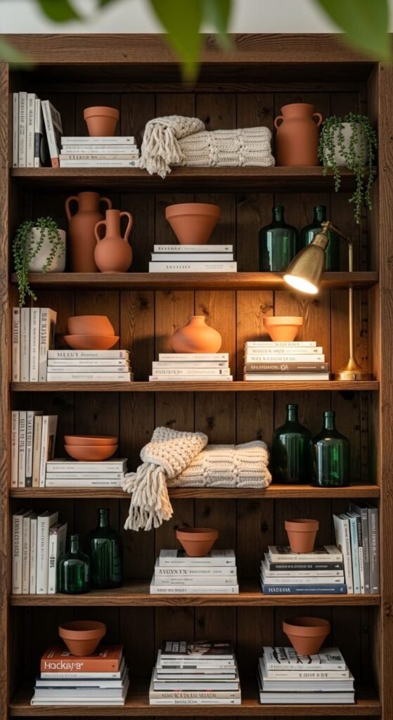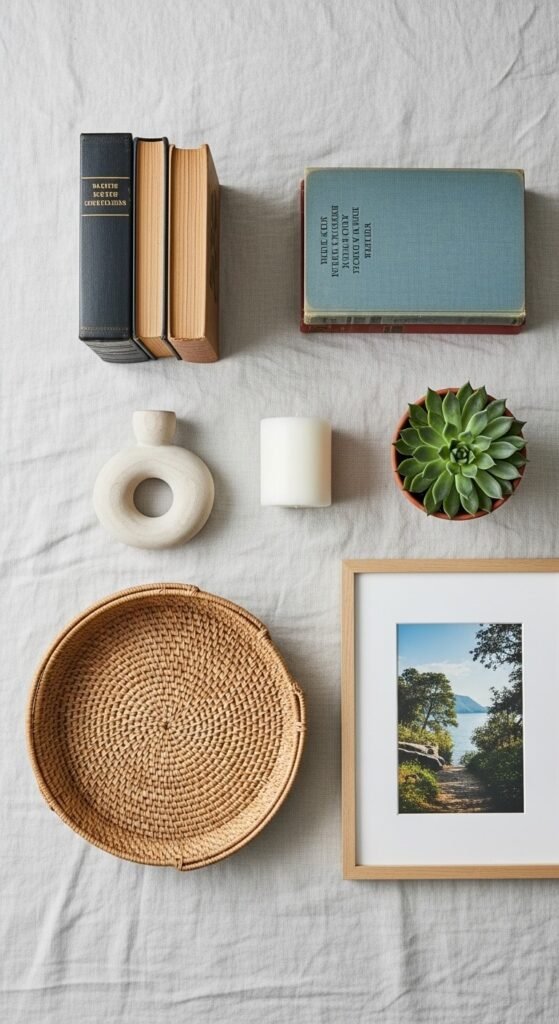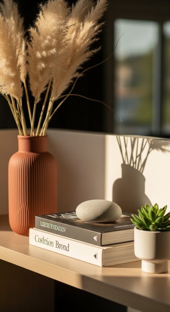 - Mix textures: matte ceramics, glossy books, natural wood, soft greenery